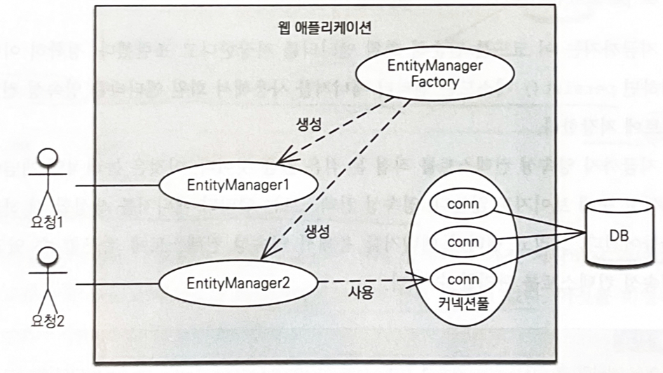 JPA 기능을 기본적으로 엔티티와 테이블의 매핑, 설계 부분과 매칭한 엔티티를 사용하는 부분으로 나눈다. 여기서 jpa 의 근간이 되는 EntityManager는 엔티티를 사용하는 부분에 해당한다. EntityManager는 말그대로 엔티티를 관리하는 관리자다. EntityManagerFactory에서 EntityManager를 생성하고 그때 영속성 컨텍스트도 함께 만들어진다.