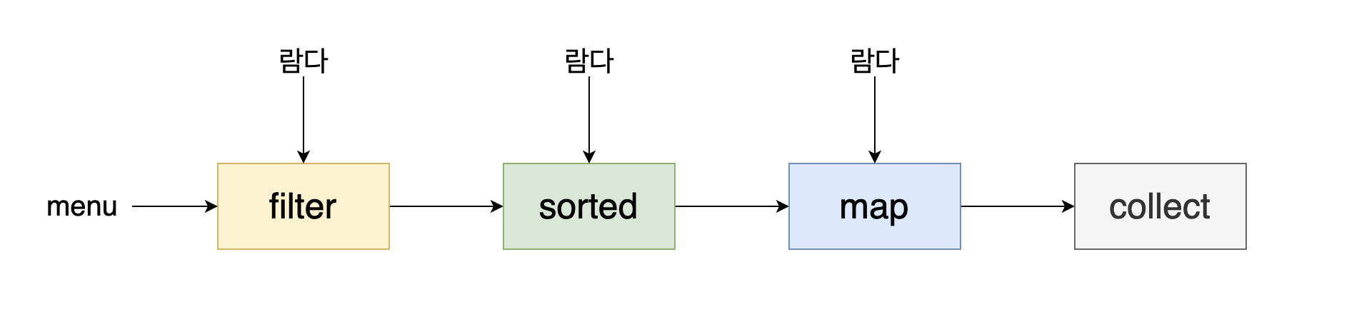 즉, 여러 연산(filter, sorted, map, collect)을 파이프라인으로 연결해도 여전히 가독성과 명확성이 유지된다. 각 연산의 결과를 다음 연산으로 전달한다.