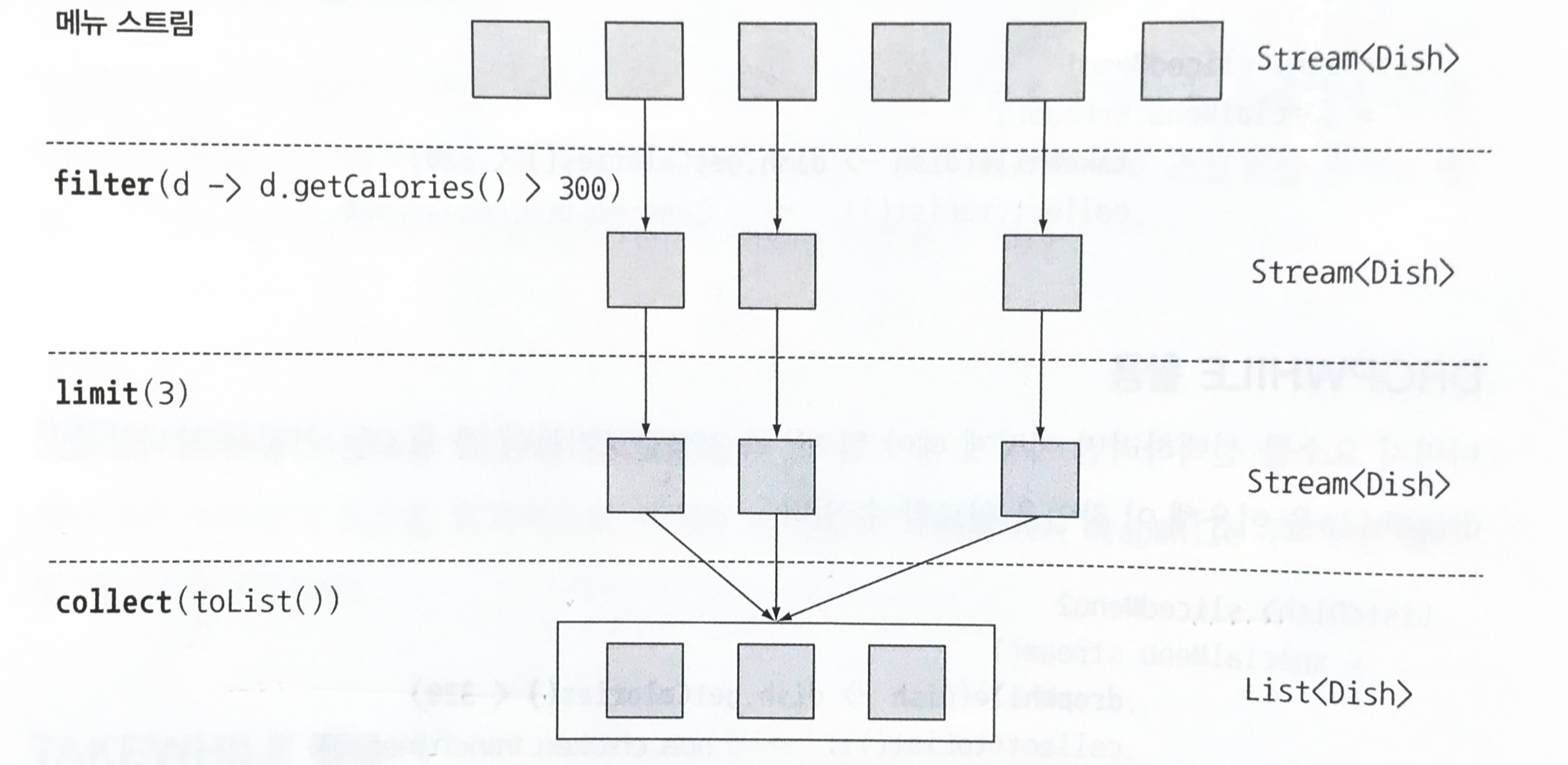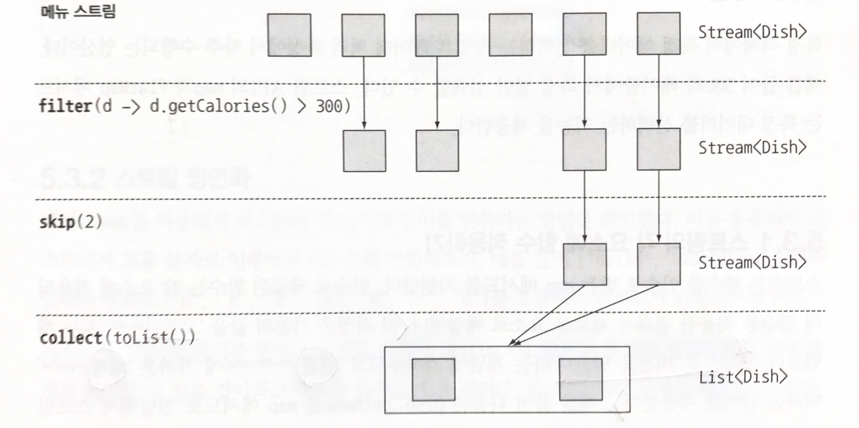 위 리스트는 이미 칼로리 순으로 정렬되어 있다는 사실에 주목하자. filter 연산을 이용하면 전체 스트림을 반복하면서 각 요소에 프레디케이트를 적용한다. 따라서 이미 정렬되어 있다는 사실을 이용해 320 칼로리보다 크거나 같은 요리가 나오면 반복을 중단 할 수 있다. 큰 작업에서는 성능에 직접적인 영향을 줄 수 있다. 이때 takeWhile() 을 사용하자.